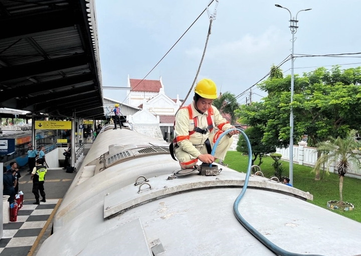 Proses ini ternyata tidak sembarangan. Para petugas harus mengikuti prosedur keselamatan yang ketat, termasuk mengenakan alat pelindung diri (APD) seperti safety vest, helm, dan sepatu khusus. Mereka juga menggunakan sistem pelindung jatuh atau lifeline saat bekerja di ketinggian.