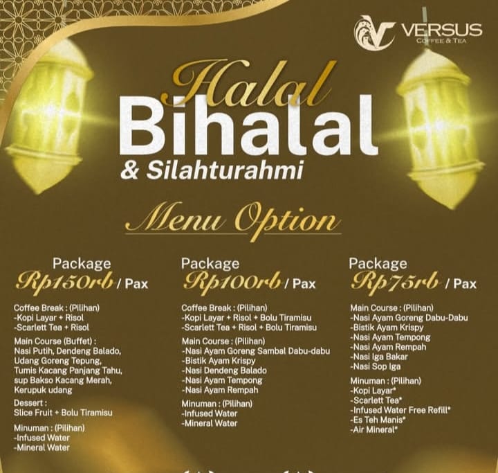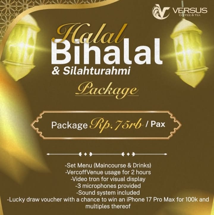 “Jangan lupa, kami siapkan hadiah iPhone 17 Pro Max ya untuk pembelian makanan dan minuman minimal Rp 100 ribu. Jangan sia-siakan kesempatan untuk mendapatkan HP canggih iPhone 17 Pro Max. Bayangkan, program menarik sekali kan hanya makan dan minum di Versus minimal Rp 100 ribu bisa berpeluang mendapat iPhone 17 Pro Max. Jadi, buruan reservasi untuk gelar acara halal bihalal di Versus Coffee and Tea,” jelasnya.