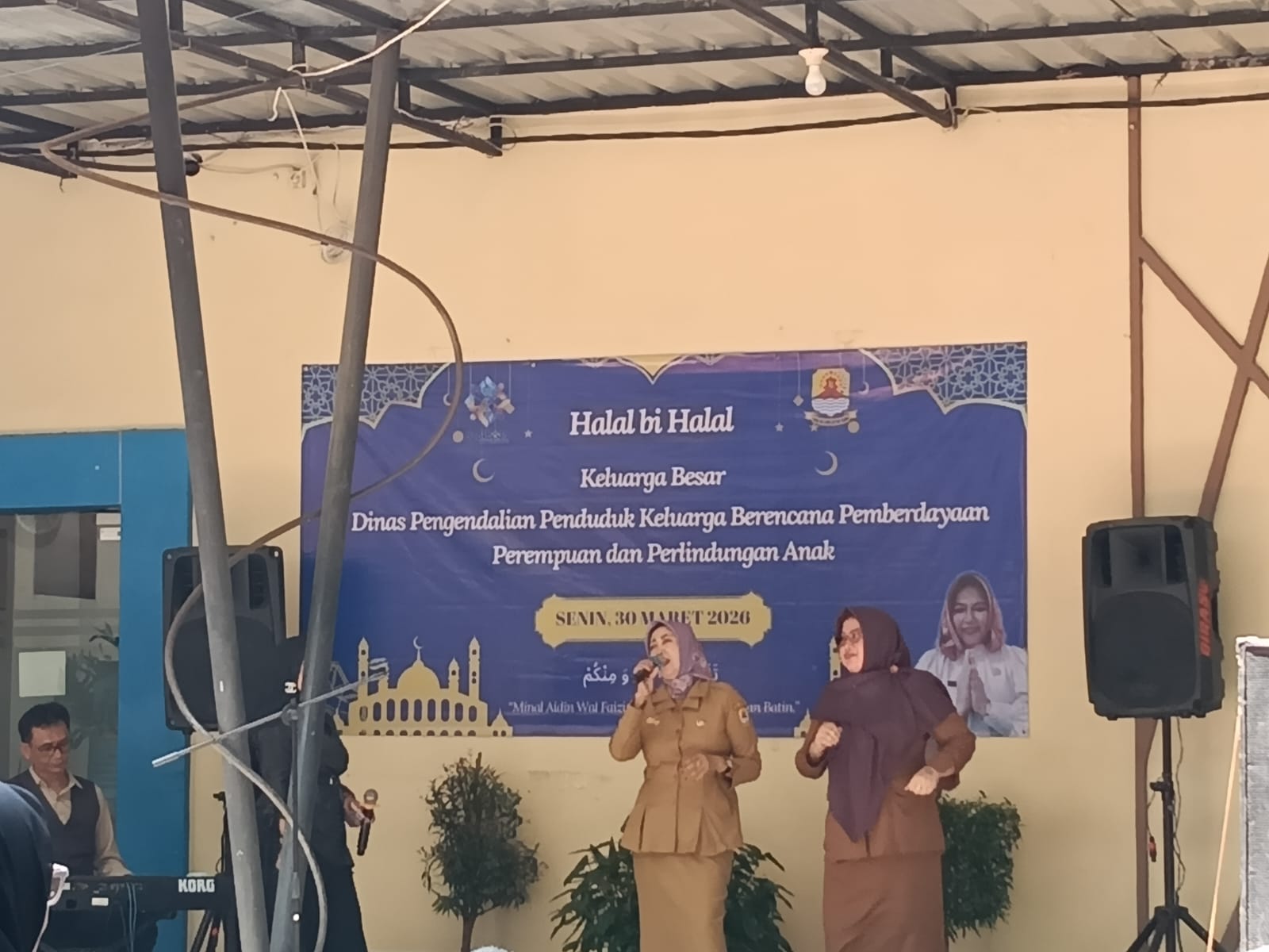 Pada spanduk acara tertulis, “Halal Bihalal Keluarga Besar Dinas Pengendalian Penduduk Keluarga Berencana Pemberdayaan Perempuan dan Perlindungan Anak”.
