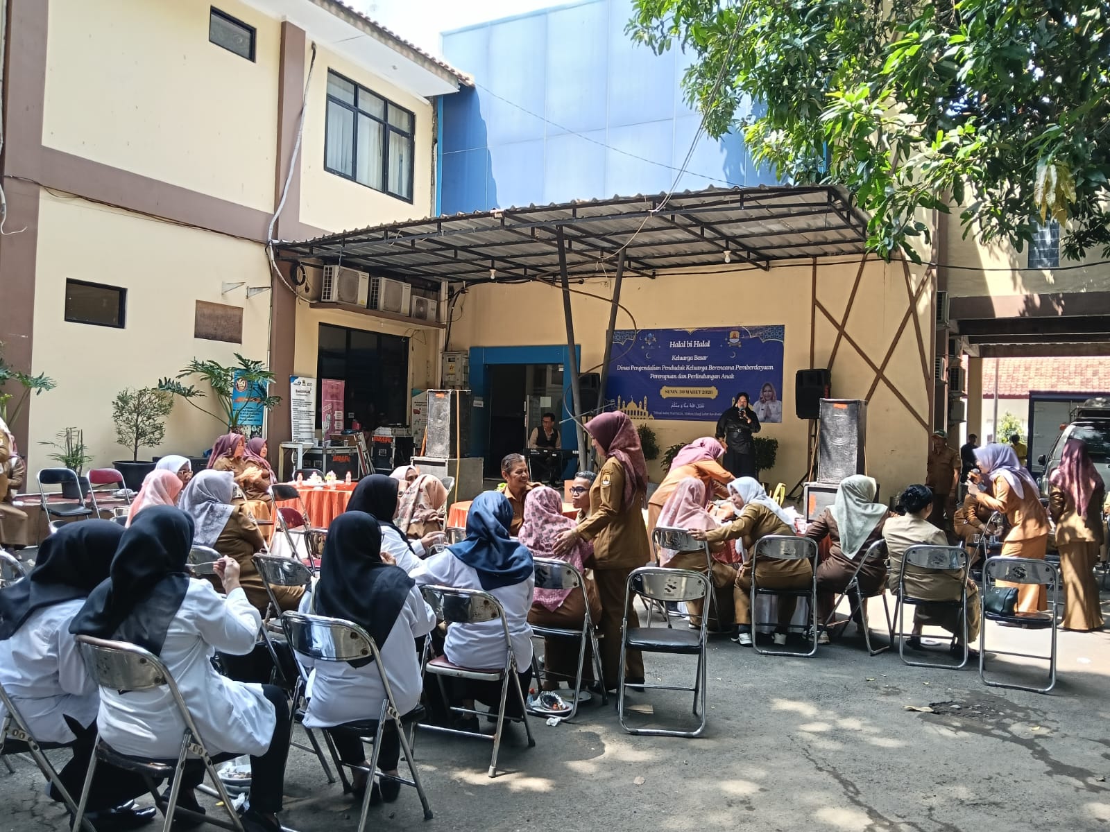Pada spanduk acara tertulis, “Halal Bihalal Keluarga Besar Dinas Pengendalian Penduduk Keluarga Berencana Pemberdayaan Perempuan dan Perlindungan Anak”.