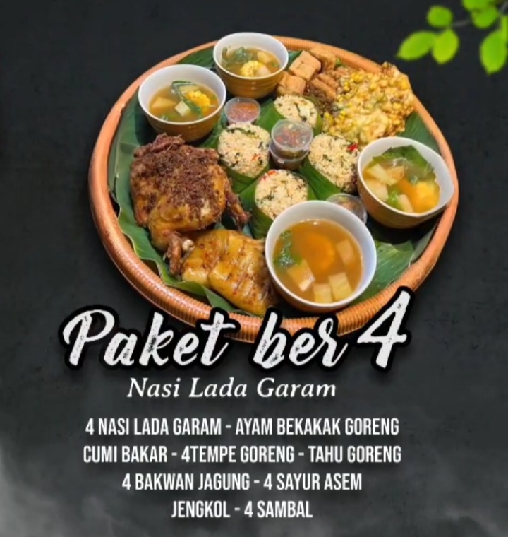 Empat nasi lada garam itu dilengkapi ayam bekakak goreng, cumi bakar, 4 tempe goreng dan tahu goreng, 4 bakwan jagung, 4 sayur asem, jengkol dan 4 sambel.