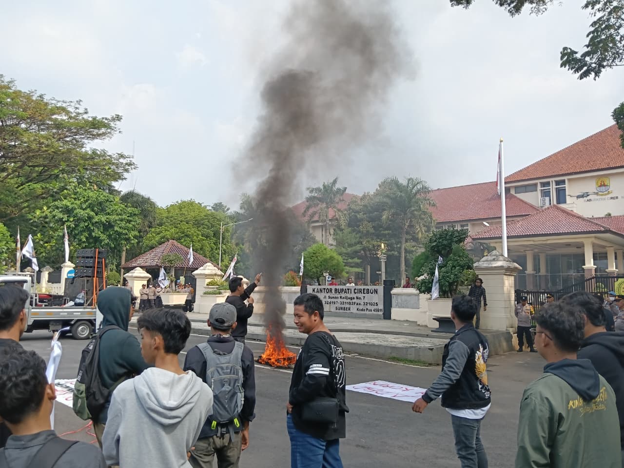 Aksi demo para mahasiswa yang berlangsung sekitar pukul 14.00 WIB, dikawal petugas kepolisian dan TNI. Tiba di kantor bupati, mahasiswa langsung melakukan orasi dan membakar ban.